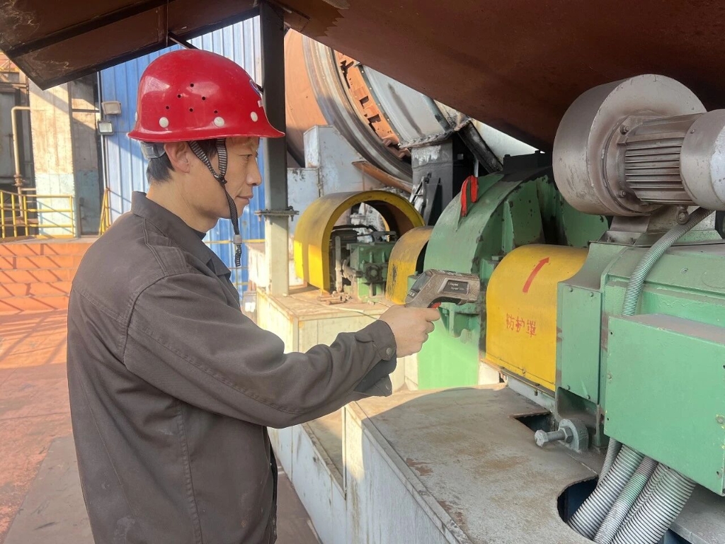 更令人称道的是他的“听诊”本领。去年的一次巡检中,他像往常一样拿着听诊棒,检查回转窑的拖轮装置。当听诊棒触碰到西北侧一组拖轮时,他敏锐地捕捉到一丝微弱的杂音。虽然相关数据显示一切正常,但他没有轻信,俯下身仔细观察,最终在拖轮压杆处发现了一道细缝。
